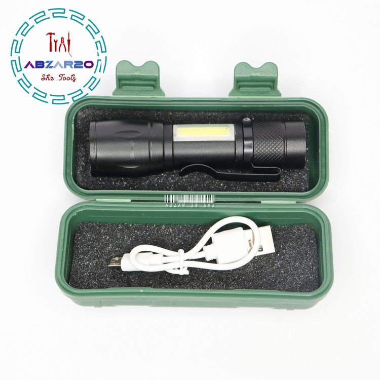 چراغ قوه پلیسی با بدنه فلزی و قابلیت تنظیم زوم و نوردهی در 3 حالت به همراه کابل شارژ usb و همچنین دارای گیره نگهدارنده ، مناسب برای استفاده خانگی، کمپینگ، مسافرت و داخل خودرو