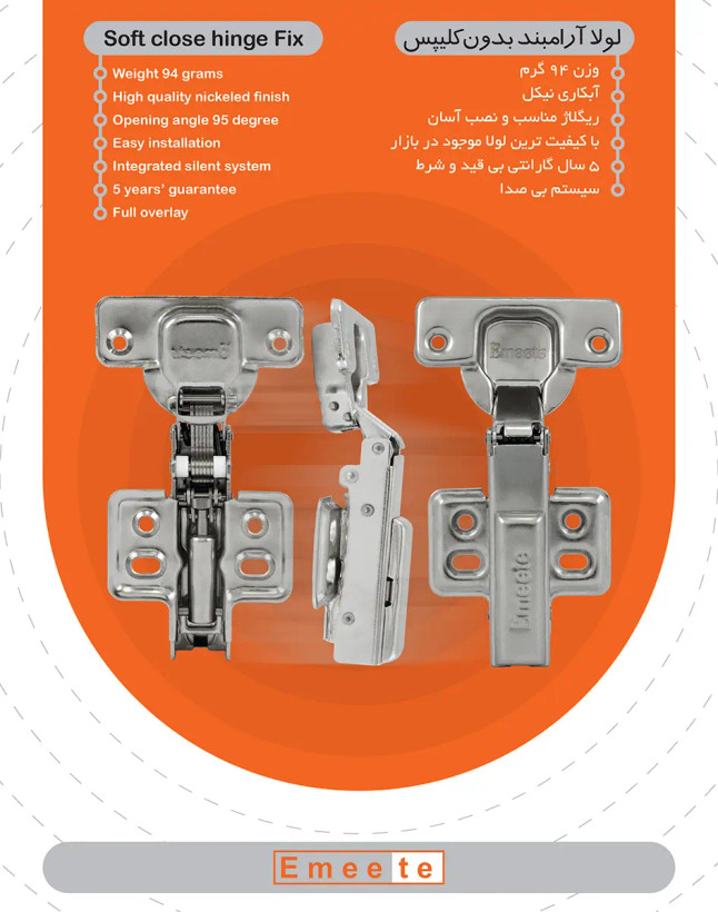 با نصب لولا گازور آرام بند Emeete میتوانید درب کابینت و کمد را در زاویههای مختلف باز کرده بدون آن که آسیبی به درب کابینت و بدنه آن وارد شود. همچنین اگر از لولا گازور آرام بند در درب کابینت و یا کمدهای خود استفاده کرده باشید، میتوانید به راحتی و بدون هیچ گونه ضربهای به محل نصب پایه لولا، درب کابینت را کامل باز کنید. این ویژگی از شل شدن پیچهای نگهدارنده لولا گازور آرام بند جلوگیری خواهد کرد. لولا گازور آرام بند Emeete از بسته شدن ناگهانی درب کابینت جلوگیری میکند و در نتیجه به هنگام بسته شدن درب صدای بلندی ایجاد نخواهد شد. این مدل لولا گازور آرام بند امیت با مقاومترین جنس در کشور ایران ساخته شده است که دارای ویژگی های بینظیری است.